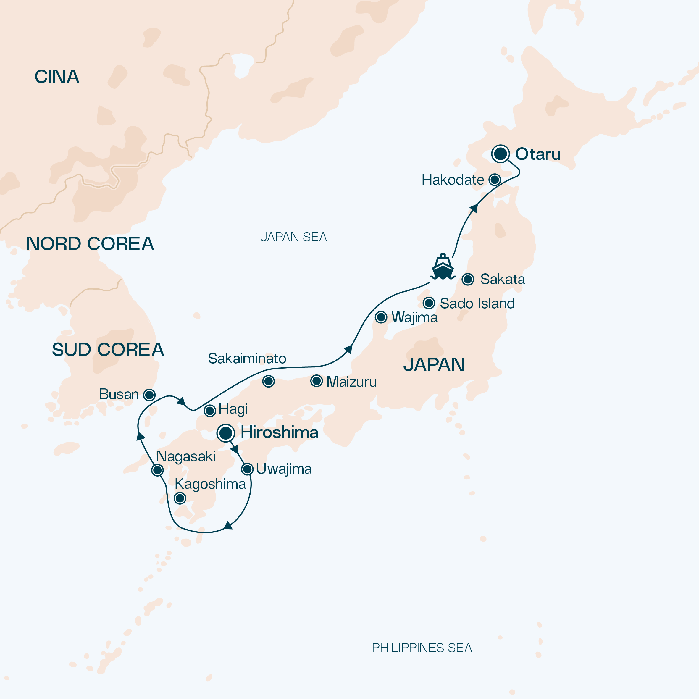 Your journey begins on Japan's western coast in the samurai heartland of Hagi and the artistic Noto port of Wajima, famed for its thousand-year-old lacquerware. Sail to the historic, resilient cities of Nagasaki and Hiroshima. Cross the sea to Busan, South Korea's vibrant coastal hub, then explore the volcanic south in Kagoshima before heading north to Hakodate and the charming gateway of Otaru. Along the way, discover cultural enclaves like Sado Island (Ogi) and mainland ports including Uwajima, Sakaiminato, Maizuru, and Sakata.