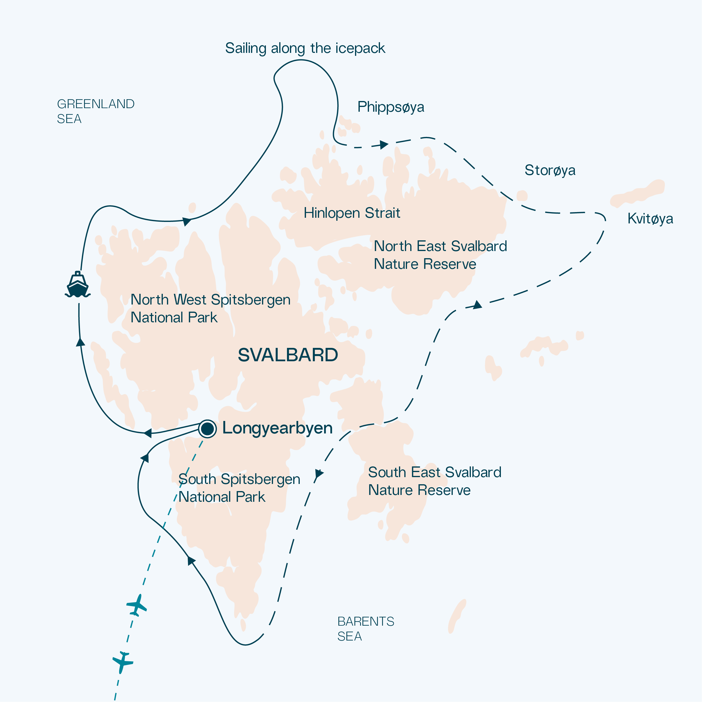 • Charter flights to the port of embarkation/ disembarkation (Longyearbyen, Ushuaia, Kangerlussuaq, Nuuk, Honiara, Jayapura and Sorong)