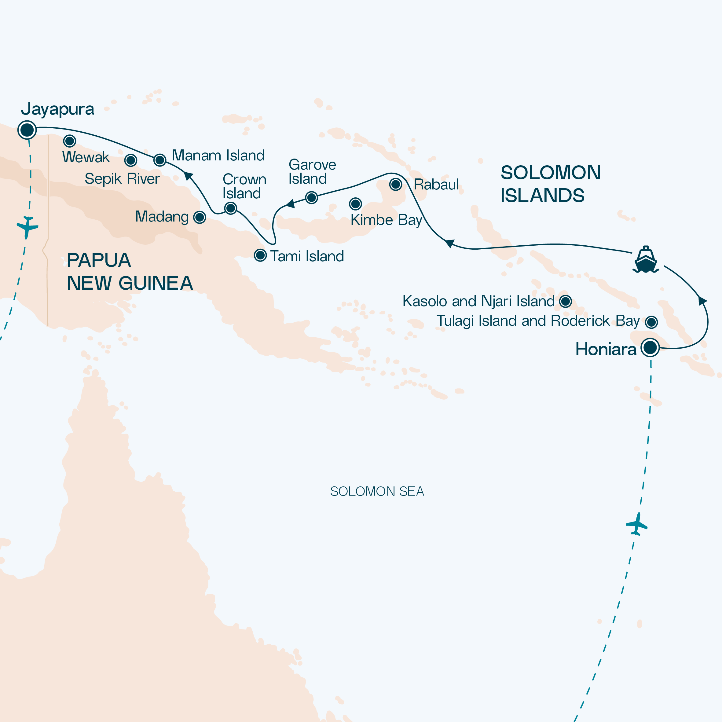 Ihre Reise beginnt in Honiara auf der Insel Guadalcanal und fuhrt Sie durch die faszinierende Inselwelt und Küstenlandschaft der Bismarcksee – Pavuvu Island, Kasolo (Kennedy) Island, die entlegene Njari Island, die vulkanischen Häfen von Rabaul sowie die artenreichen Meeresgebiete der Kimbe Bay. Weiter geht es nach Garove, Tami und Crown Islands, bevor Sie die malerischen Küsten von Madang und Manam erkunden. Entlang des geschichtsträchtigen Sepik-Flusses gelangen Sie zum Dorf Koper, besuchen Wewak und beenden Ihre Reise in Jayapura, Papua.